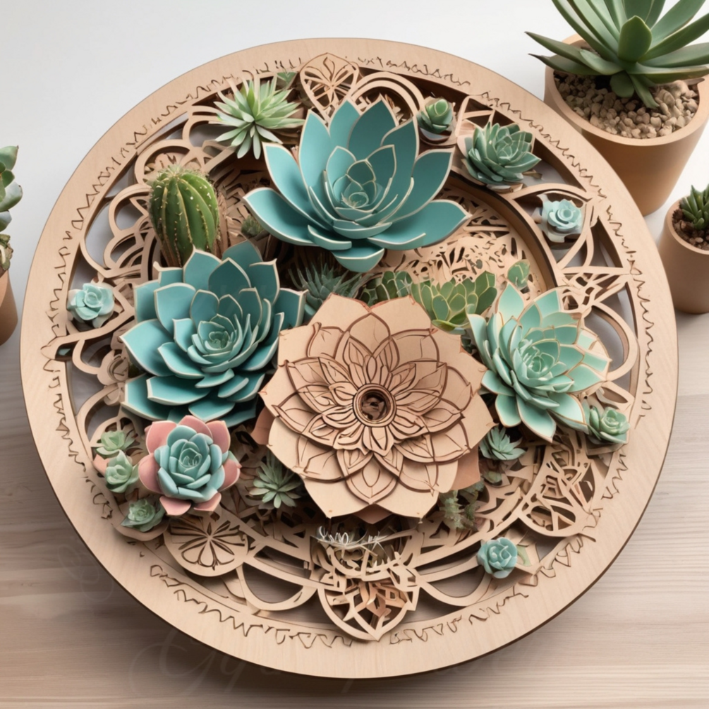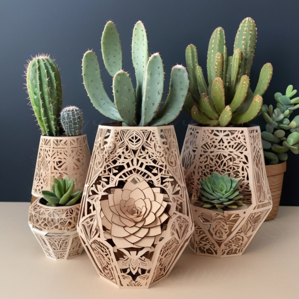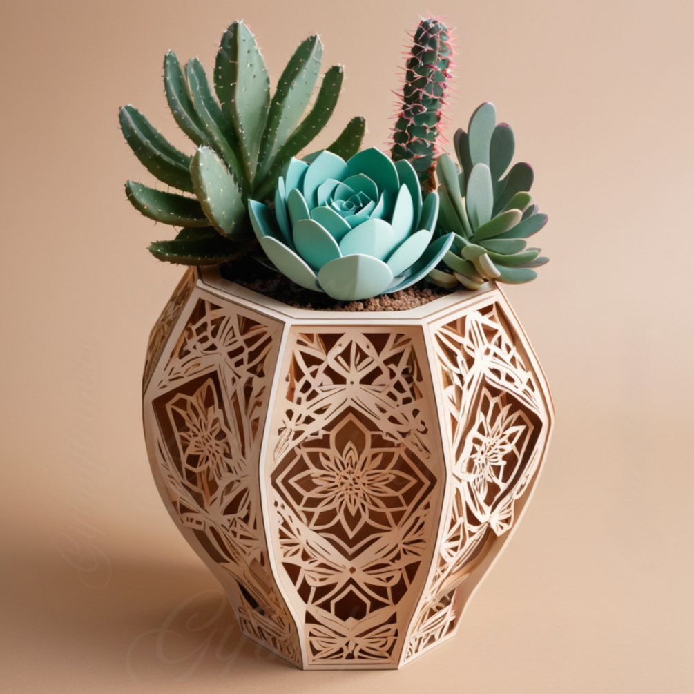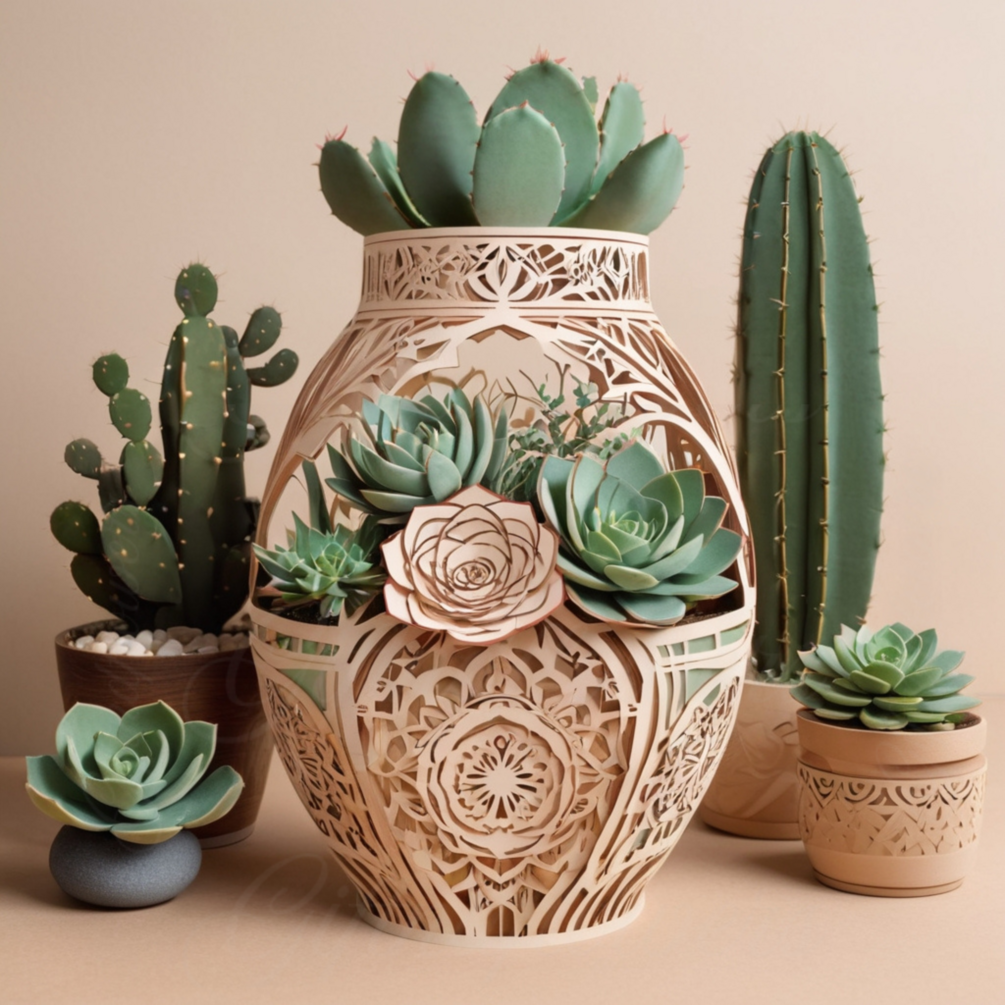 Boho Geometric Vase – Mandala Laser Cut File with Succulents & Cacti