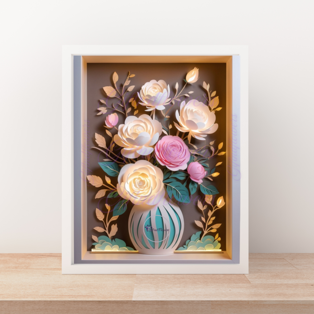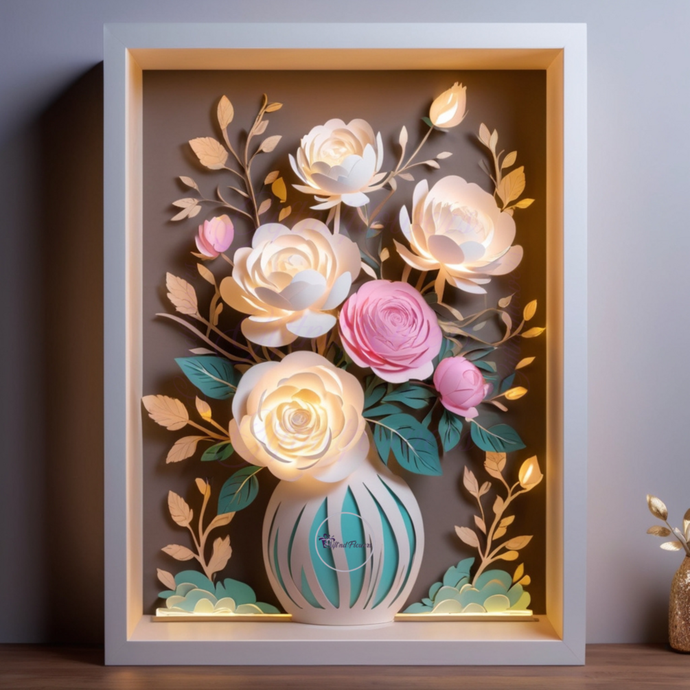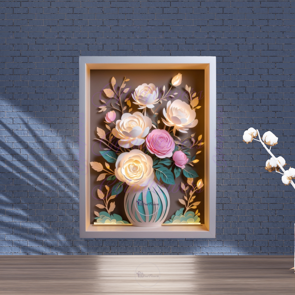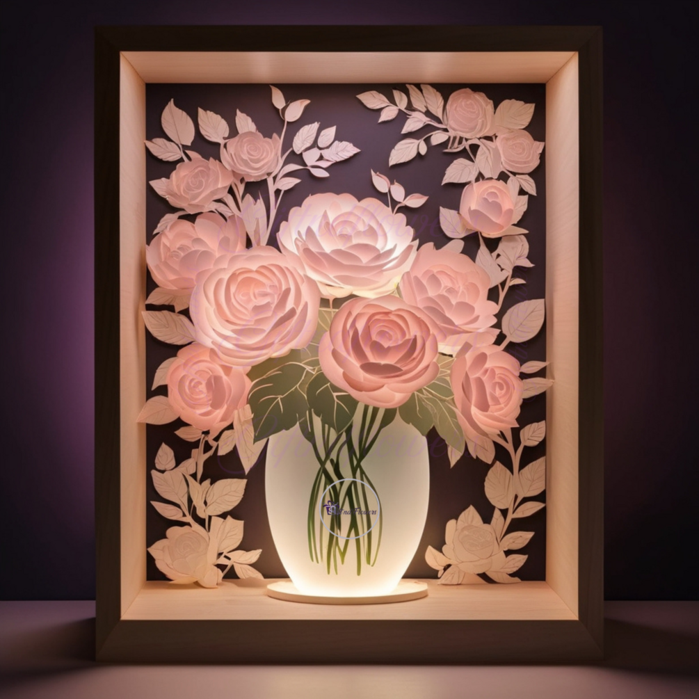 3D Floral Shadowbox Vase | Layered Paper Cut Template with LED Slot | Wedding Decor Cricut | Peony & Rose Shadow Box | Glow Light Box