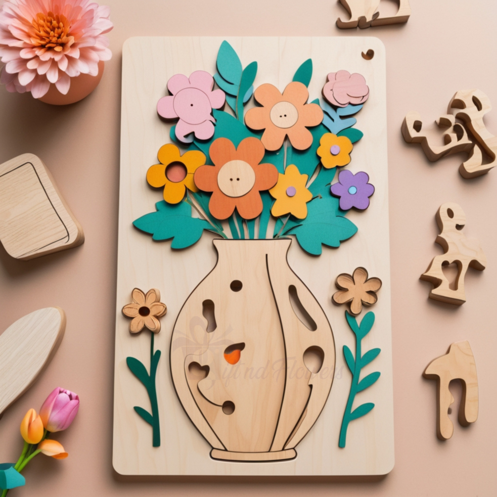 Kids Puzzle Vase SVG – Interactive Wooden Vase with Detachable Flowers & Animal Shapes – Nursery Decor – Glowforge Cricut Cut File