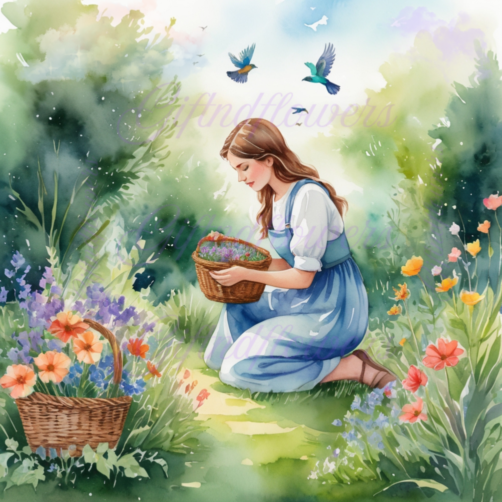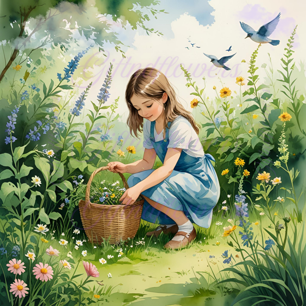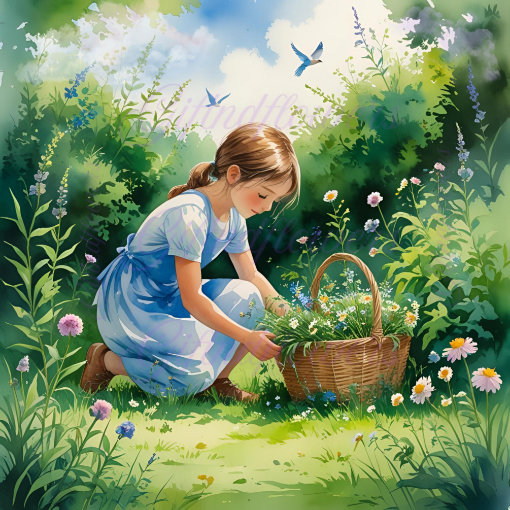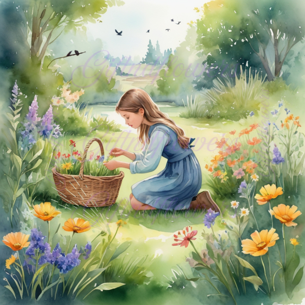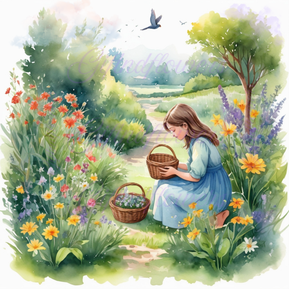 Bring soft, springtime charm to your creative projects with this Girl Picking Flowers Watercolor Clipart Bundle. This lovely collection features 6 high-resolution PNG images of a young girl peacefully gathering blooms in a lush garden scene. Perfect for nursery decor, journals, greeting cards, and so much more!