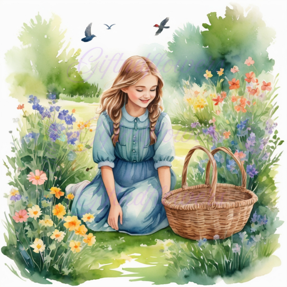6 PNG Clipart Images – Girl Picking Flowers Watercolor Art – Instant Digital Download for Crafts, Decor & More
