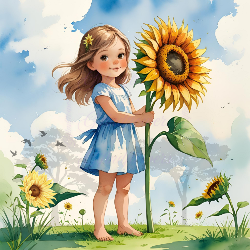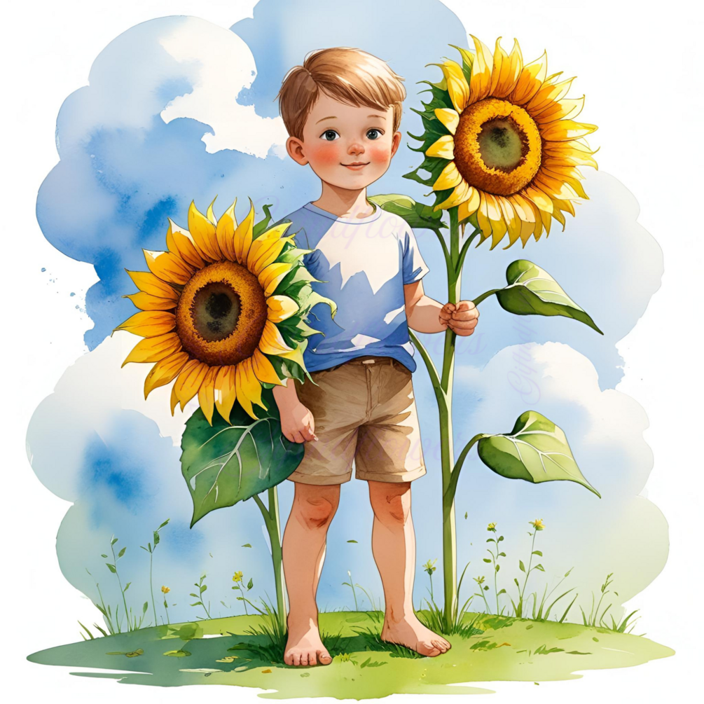 Bring warmth and innocence to your creative projects with this Child with Sunflower Watercolor Clipart. This tender illustration features a barefoot child holding a bright sunflower, standing on soft green grass under a dreamy sky. The soft watercolor tones and transparent background make it ideal for a wide range of design projects.