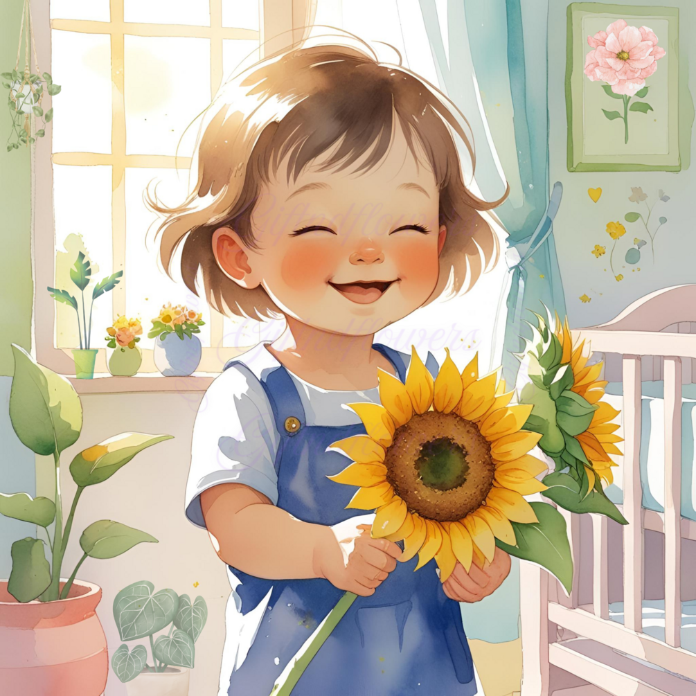 🌻 Sunshine & Smiles! 6 PNG Clipart Image – Child Holding Sunflower Watercolor Art – Instant Digital Download for Nursery & Crafts