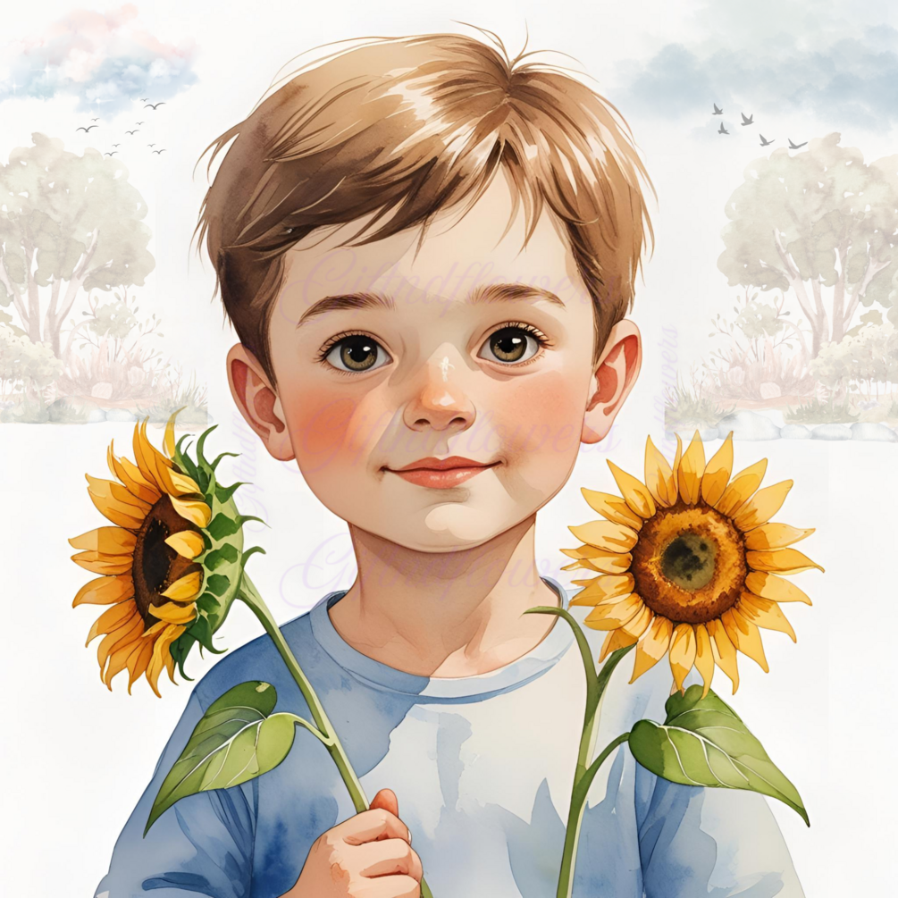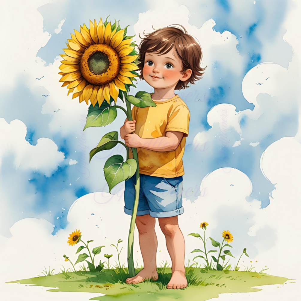 Child Holding Sunflower Watercolor Art