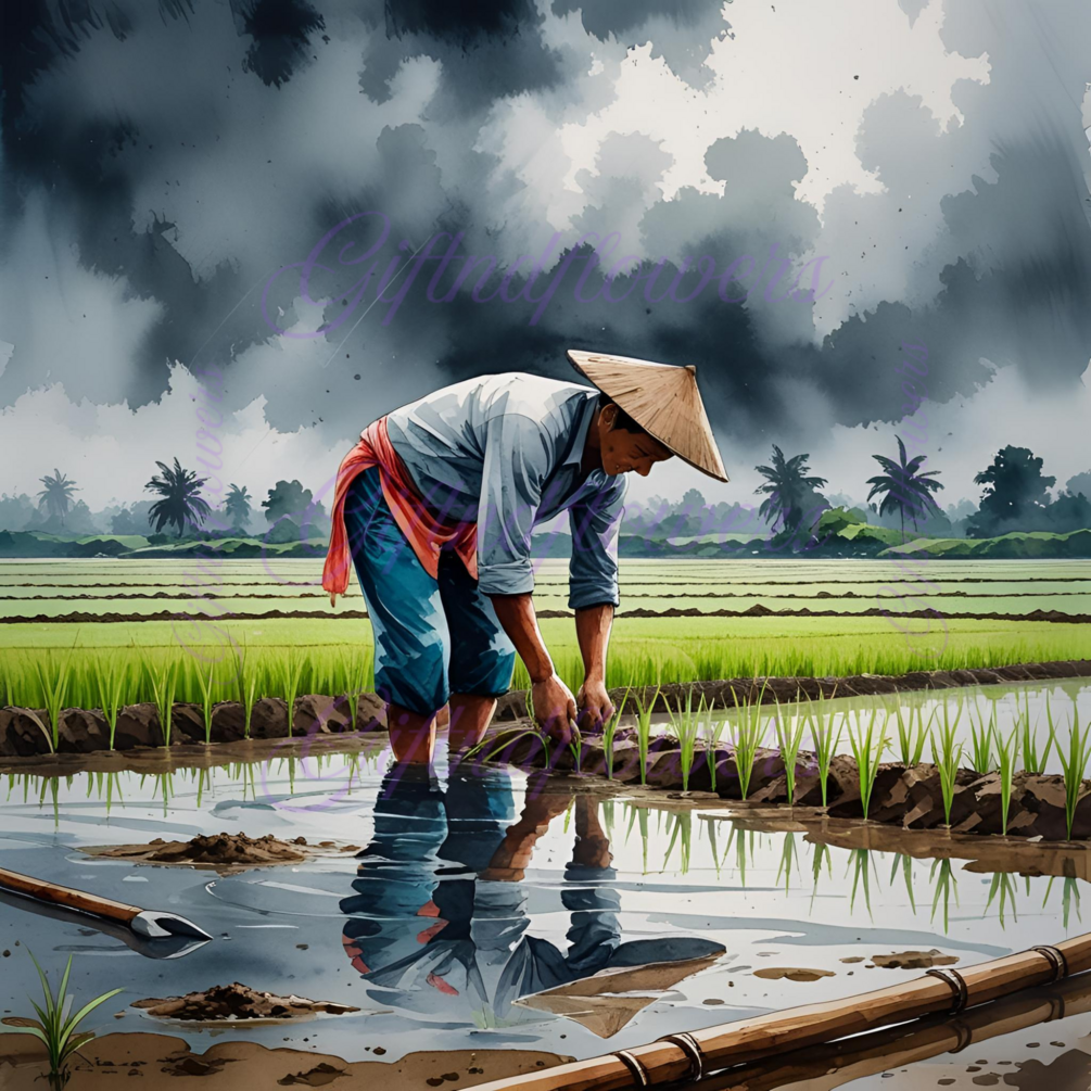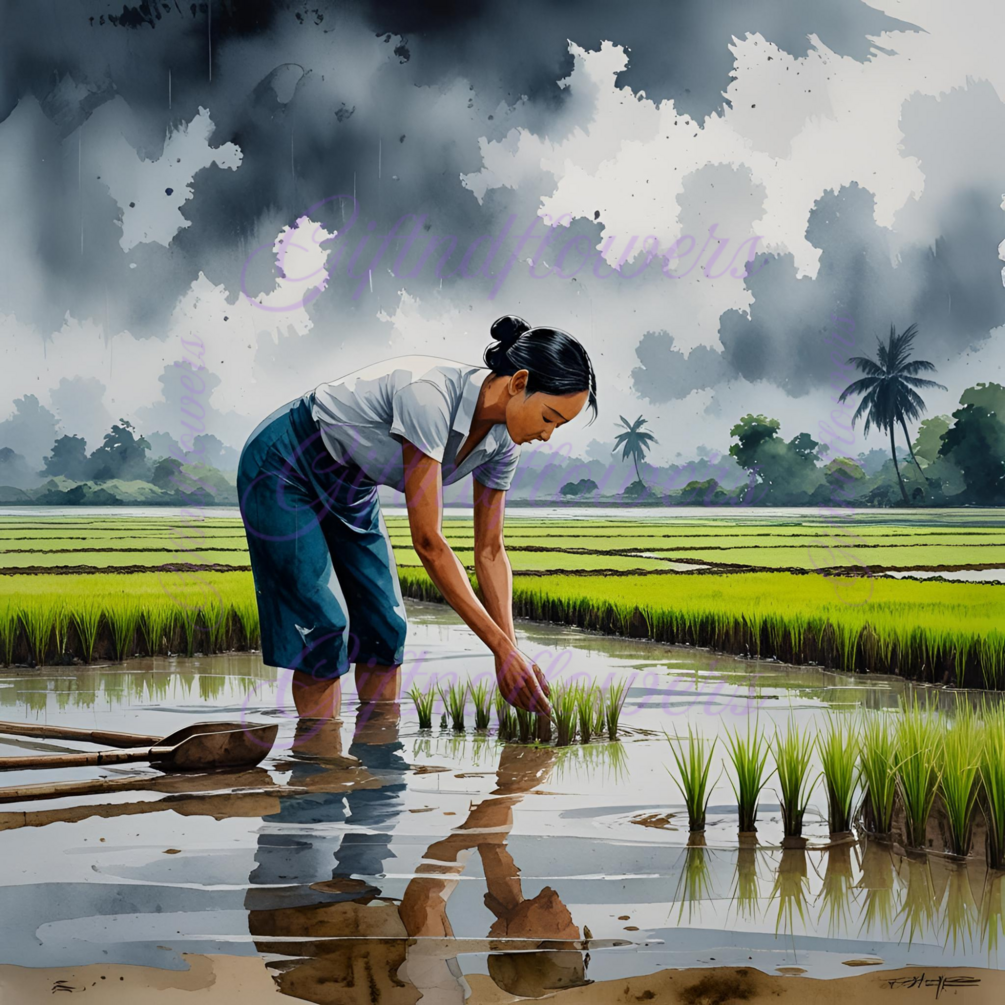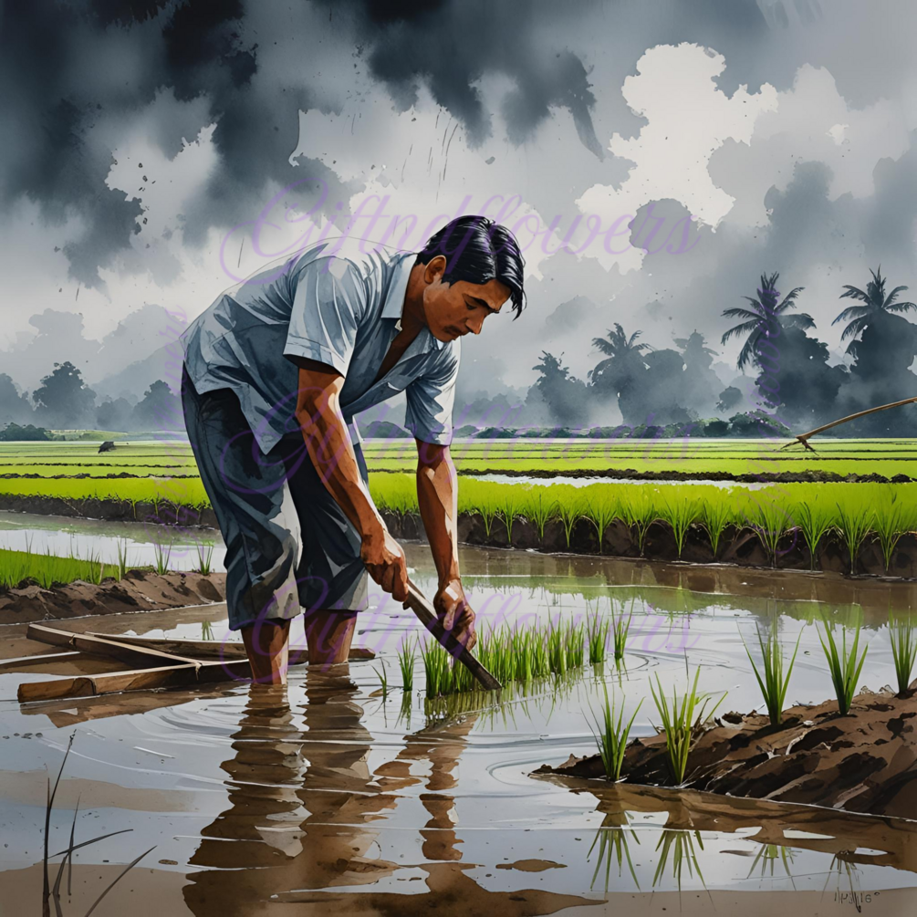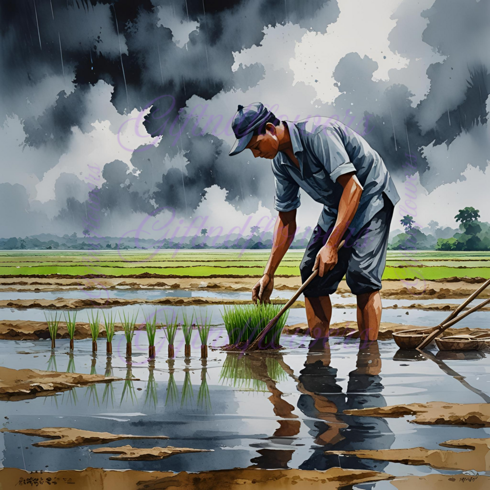 Celebrate the beauty of traditional farming with this Farmer Planting Rice Watercolor Clipart. Hand-painted in a rich, earthy palette, this illustration captures a serene rural scene: a farmer bending over to plant rice seedlings in a waterlogged paddy field, under a dramatic monsoon sky. Soft reflections in the muddy water, gentle drizzle, and nearby farming tools add depth and authenticity to this peaceful moment in nature.